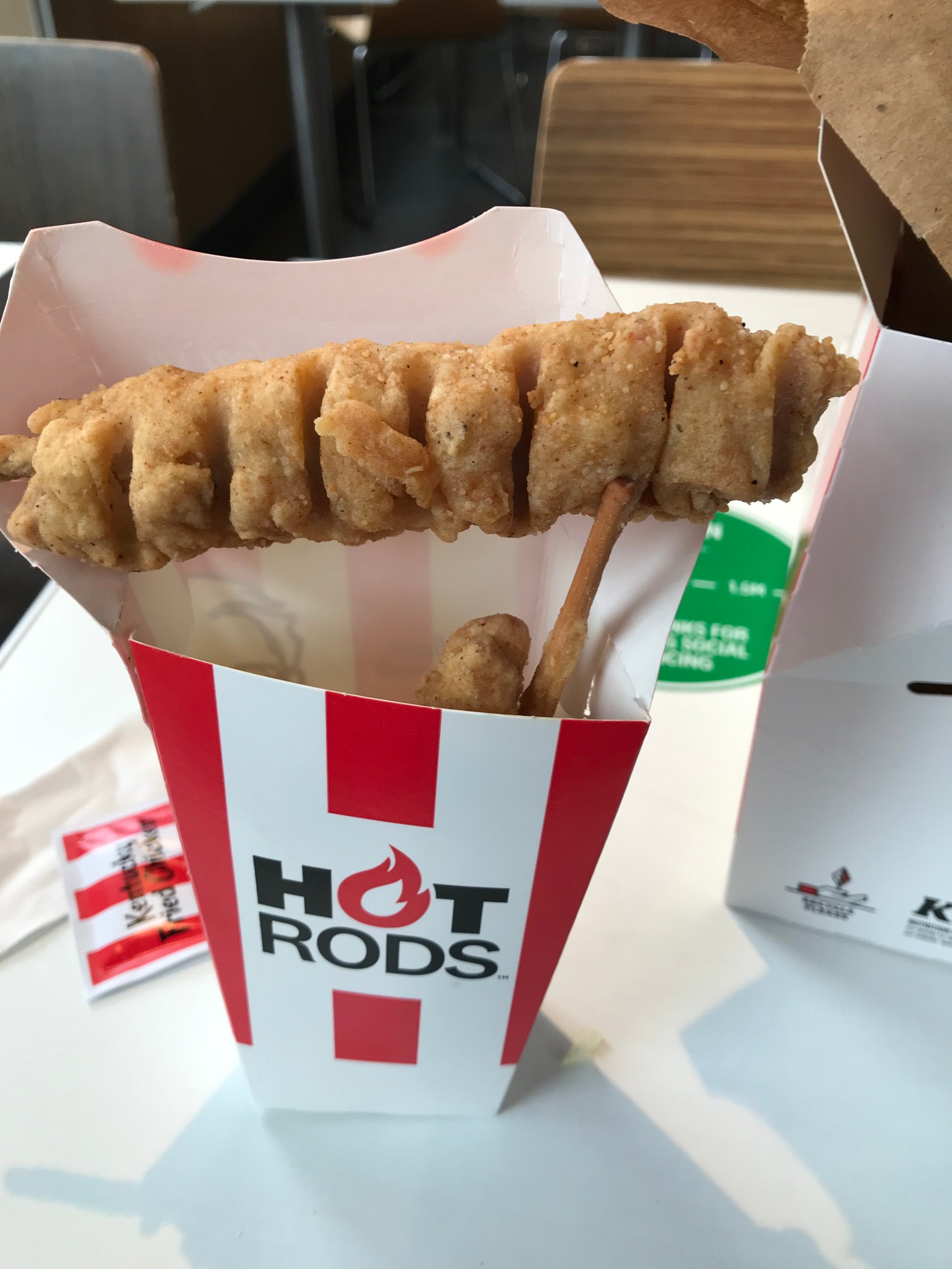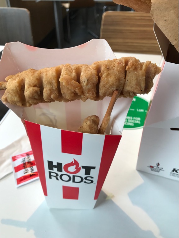 First, the hot rods. What on earth is a hot rod I hear you ask? Great question. Basically, I discovered, a hot road is a chicken shish kebab coated in hot and spicy sauce and then deep fried. Definitely an intriguing idea but ultimately, to save you from the disappointment I felt at discovering this for myself, a dismal failure. The chicken itself was extremely slimy presumably thigh off cuts / floor sweepings. It was coated in hot and spicy which, if it’s your thing fair play to you, but it certainly isn’t mine. I also have some suspicions that the coating wasn’t legitimate 12 herbs and spices. I ate half of one hot-rod and shamefully threw out the rest.