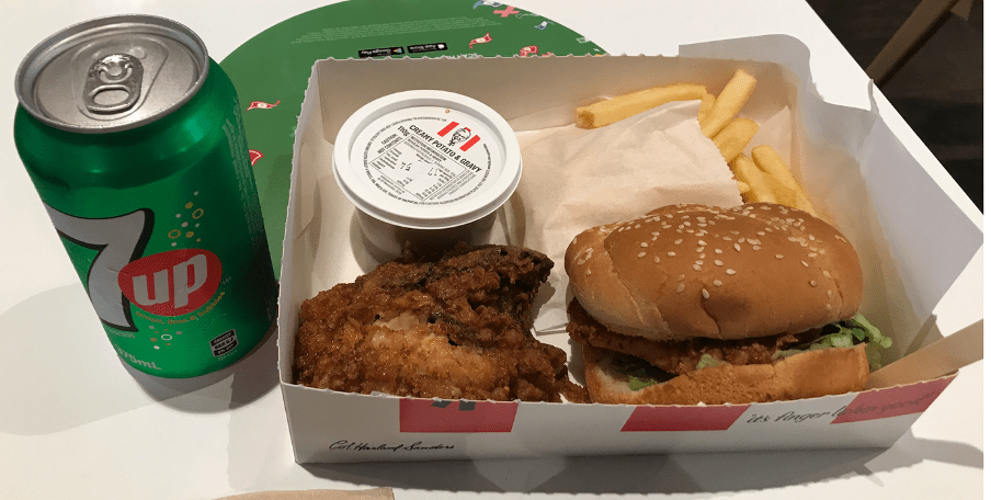 Amateur dramatics concluded, I ordered an Ultimate Box for $11.45. In this bad boy is an original recipe burger (no mayo), a piece of original recipe chicken, a potato and gravy, some chips (extra seasoning), and a revitalising 7up.